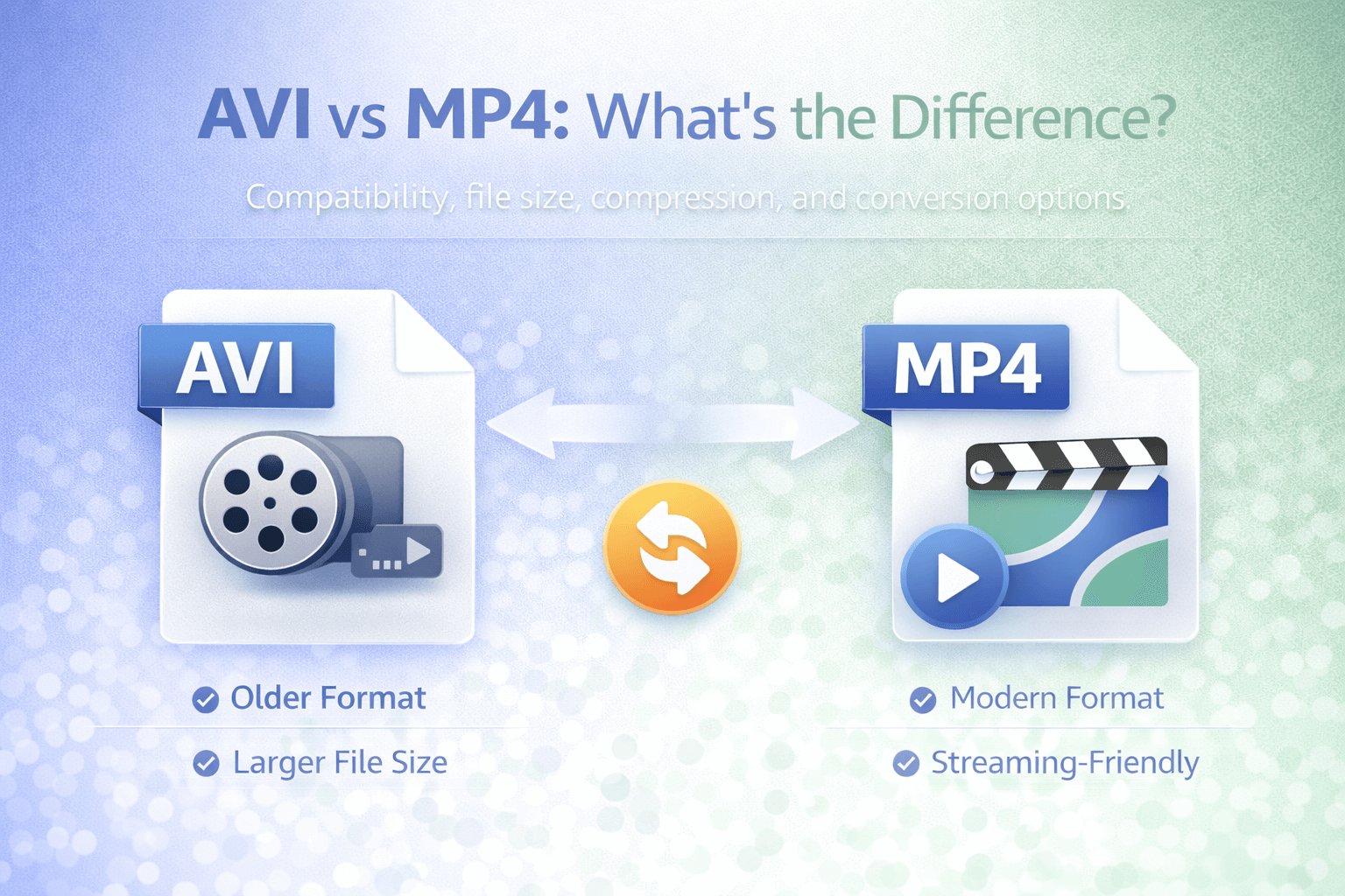 AVI vs MP4 comparison banner showing differences in file size, compression, and streaming compatibility.