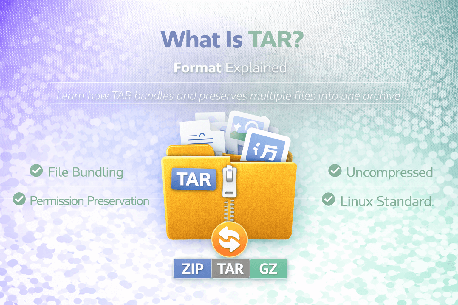 This separation of archiving and compression provides flexibility. You can choose different compression methods while maintaining the same archive structure. If necessary, you can use our free tools to convert TAR to ZIP or convert TAR to GZ.