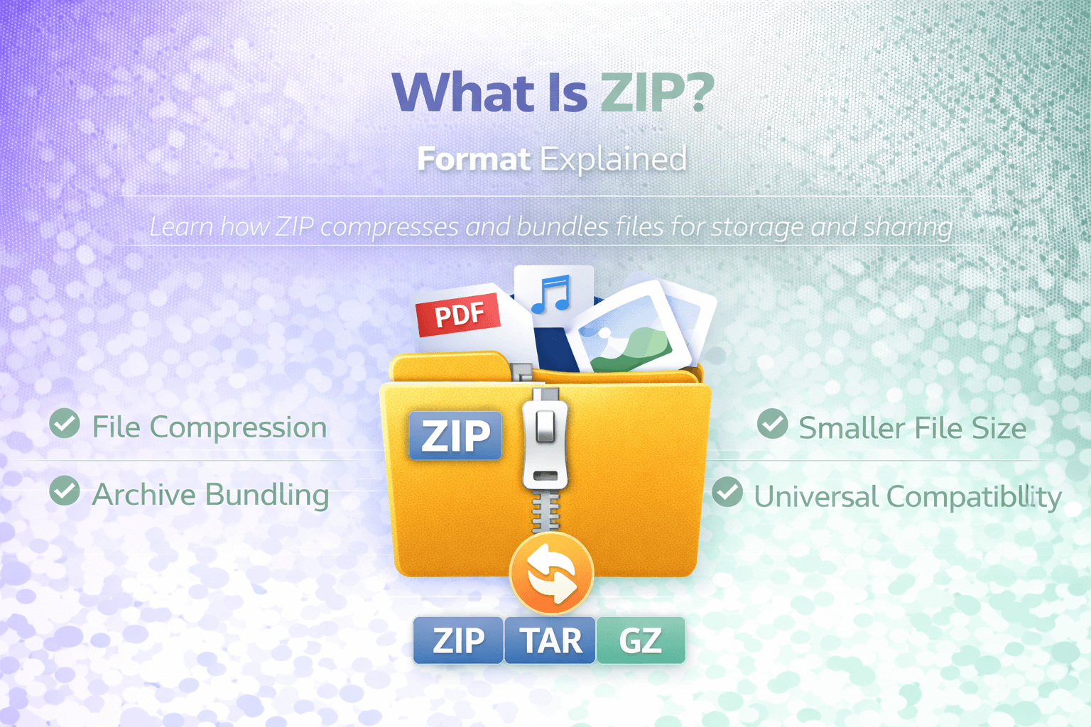 ZIP archive format banner showing file compression, archive bundling, and universal compatibility.